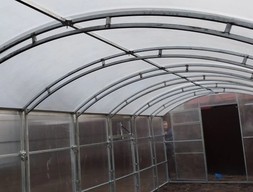 Соединение: Система «Краб» (обеспечивает плоскостное прилегание поликарбоната и высокую жесткость на разрыв. 4стяжки и перемычка сверху Шаг 1м5м. Высота 2,3м. Ширина 3м. Ребра на стенах выполнены из двойной трубы